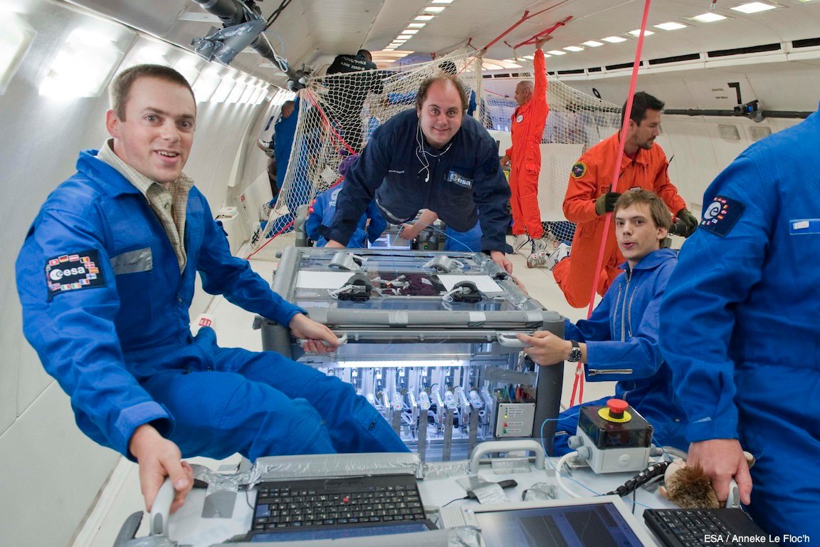 ![]() | Our first parabolic flight! We were ambitious and brought 3 experiments: a freely cooling granular gas, a set of 16 springs with attached granular damper for a detailled parameter study and a set of 2 large grain filled boxes attached to springs and surrounded by high-speed cameras to take an in-depth look at the granular dynamics inside. |